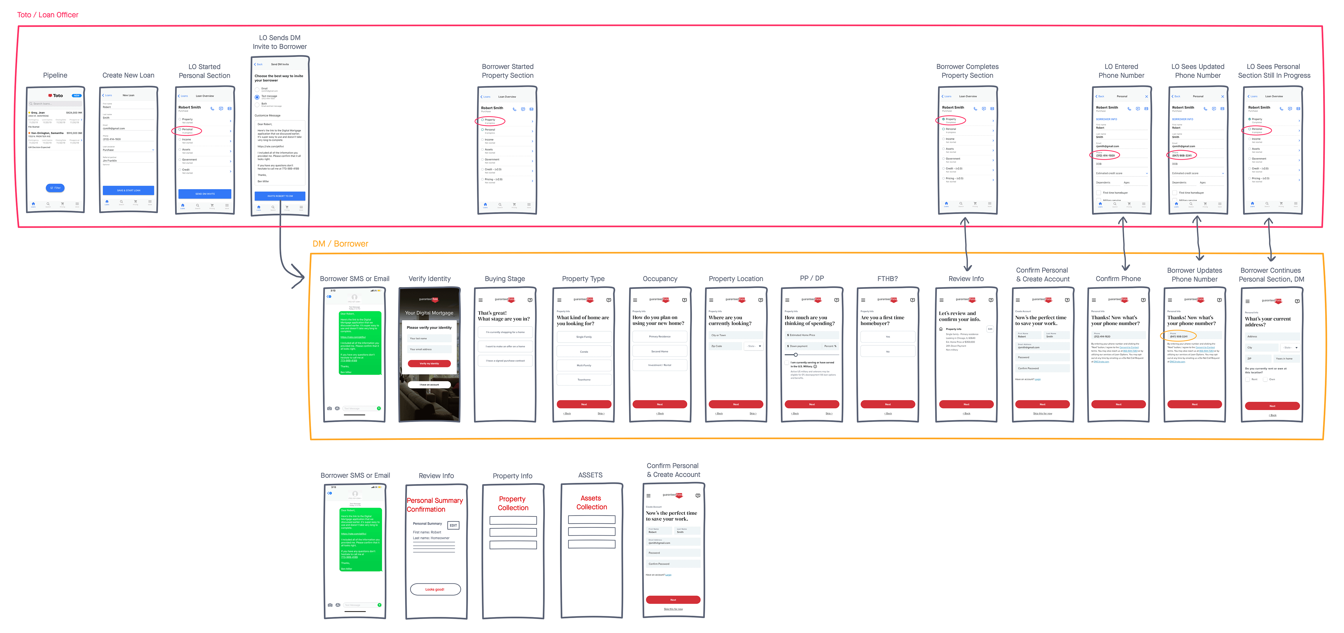 To start, I conducted user interviews with over a dozen LOs and their entire support staffs. I learned about their process, the order in which they operated, how they communicated and kept track of everything amongst themselves, their customers and what the biggest pain points were.